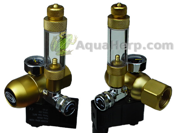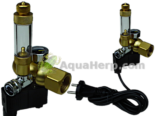 CO2 Hiilidioksidipullon regulaattori solenoidilla. Kasvien hiilidioksidilannoitukseen akvaariossa, kasvatusteltassa, kasvihuoneessa yms. Regulaattori (paineenalennusventtiili) sopii tavalliseen uudelleen täytettävään standardikaasupulloon (regulaattoria voi käyttää myös muiden kaasujen kuin hiilidioksidin kanssa). Regulaattorilla kaasun virtaus pullosta voidaan säätää sopivaksi ja solenoidilla kaasun syöttö voidaan automatisoida. Solenoidissa on 230V pistoke, eli solenoidia voi ohjata pistorasian sisältävällä 230V ohjauslaitteella kuten ajastimella tai pH-kontrollerilla. Käytännössä hiilidioksidin syöttö voidaan esimerkiksi ajastaa valaistuksen mukaisesti, eli kaasua syötetään vain valoisana aikana jolloin kasvit yhteyttävät.